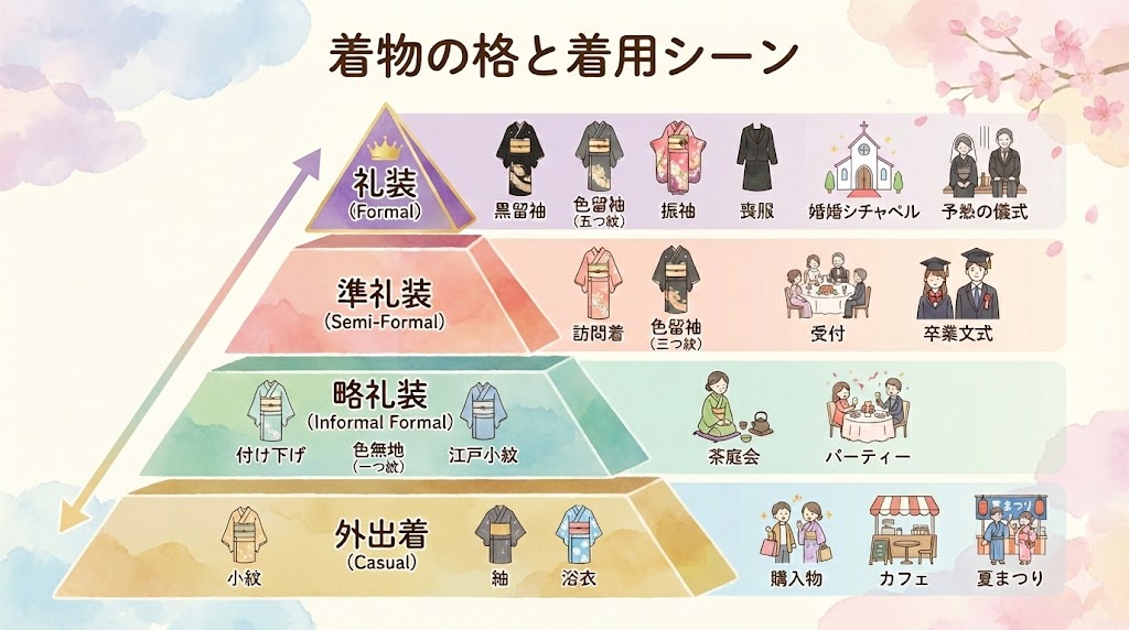 結婚式にジーンズで行かないのと同じように、着物にもその場にふさわしい格があります。